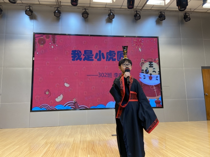 决赛的演讲主题高段是如虎添翼,低段是虎虎生威。12名选手根据主题自行创作演讲内容,百人评委团来自于每个班精选出的八个学生,现场比拼中随机抽取学生评委嘉宾进行点评。