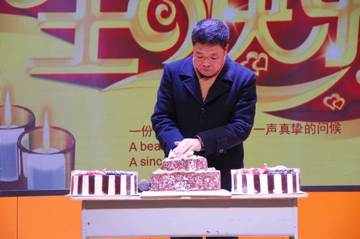 王少斌校长为生日老师切蛋糕。