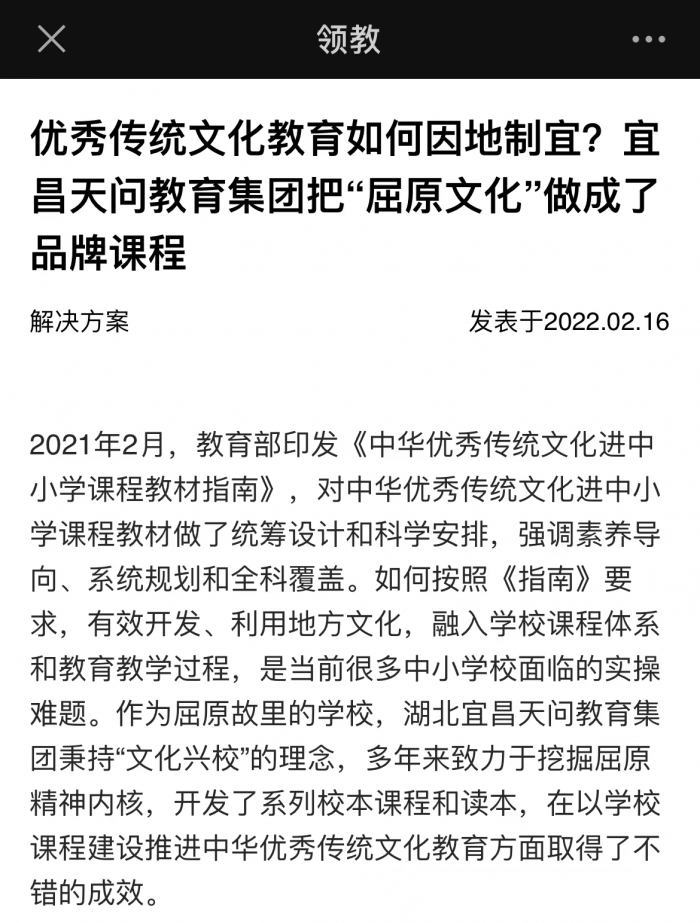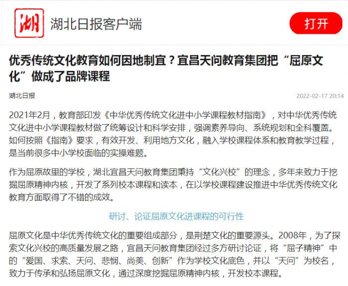 2月17日,中国教育报刊社教育大数据研究院重磅关注“天问文化兴校”,领教官方平台及湖北日报发表集团总校长高正华署名文章——《优秀传统文化教育如何因地制宜? 宜昌天问教育集团把“屈原文化”做成了品牌课程》。