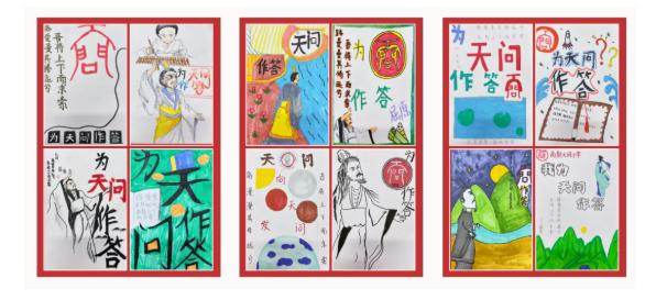 “为天问作答”课程。学校通过综合实践作业,将《天问》当中的172个问题分到每个班级,班级内分组认领自己感兴趣的题目,通过查阅资料、想象绘画、视频演说等方式进行作答,引导学生主动了解天文地理历史等知识,领悟并学习屈原敢于发问、不断创新的精神。