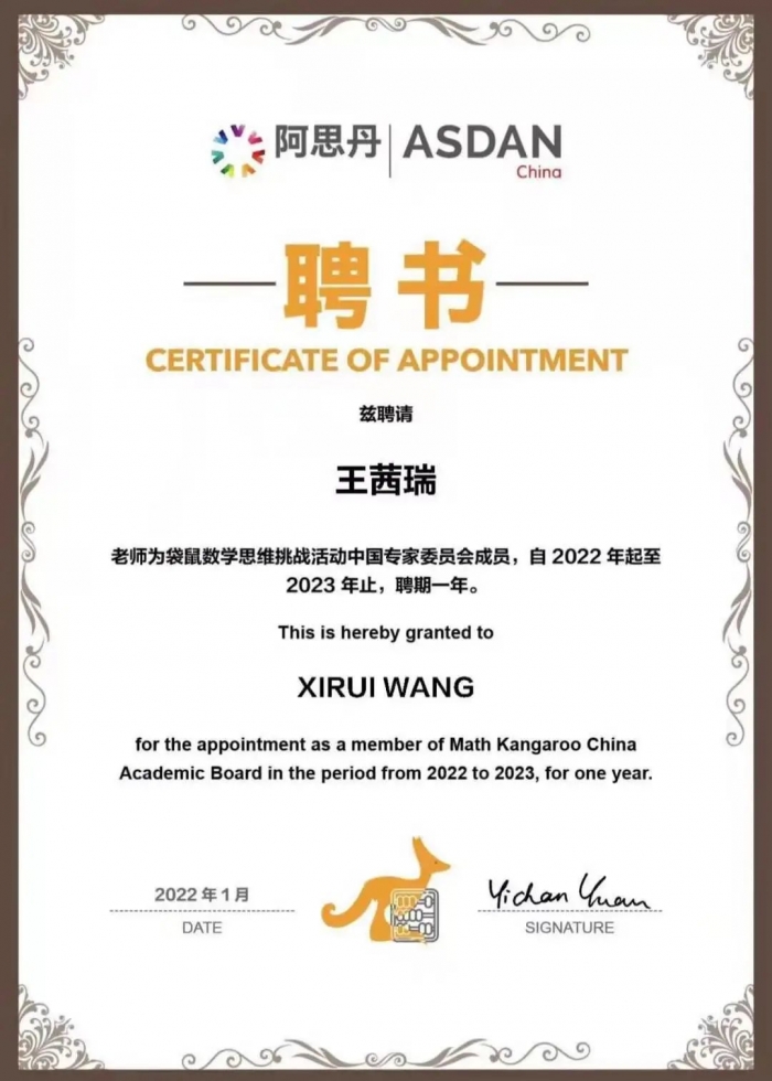 2022年1月21日,王茜瑞老师卓越的教学能力得到了袋鼠数学思维挑战赛官方认可,被聘为“第二届袋鼠数学中国专家委员会成员”。