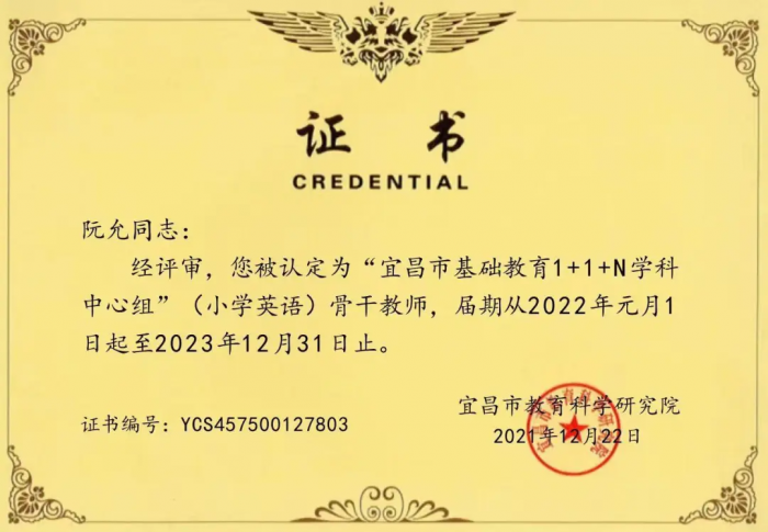 鲁君老师被认定为“宜昌市基础教育1+1+N学科中心组”(中小学书法)骨干教师、阮允老师被认定为“宜昌市基础教育1+1+N学科中心组”(小学英语)骨干教师。