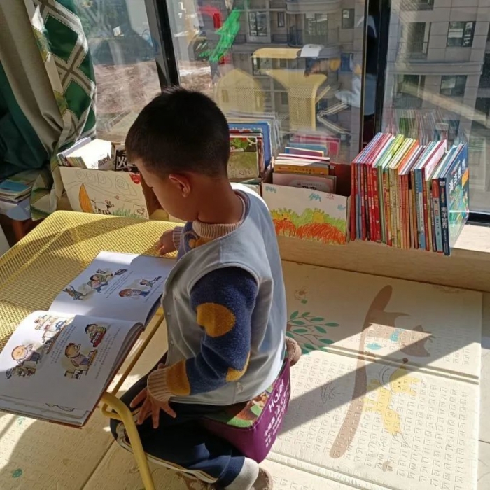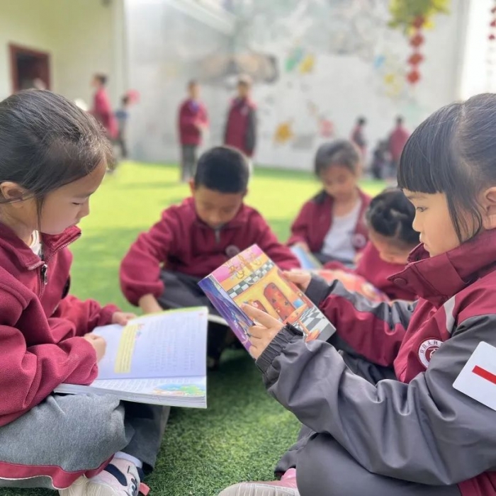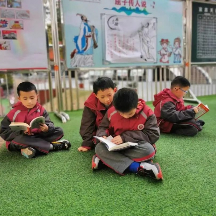 每逢课余时,便能看到小书宝们手捧书籍,三三两两的坐在阳光照耀下的童话广场阅读,有看着看着皱眉头的,也有看着看着笑趴下的,各种表情都有,很率直,很可爱。