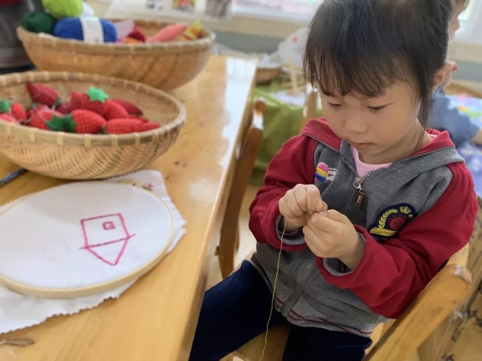 我班刺绣区角已开展一年有余,在这一年多的时间里 ,我们通过集体教学和家园共育,帮助孩子们掌握了最基本的刺绣技能,如:穿针引线、打结、收纳。在日常的区角活动中,孩子们非常喜欢在刺绣区串珠子、画画、刺绣……