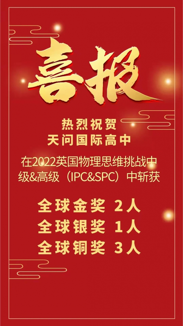 近日,2022年英国物理思维挑战中级&高级(IPC&SPC)成绩揭晓。天问国高学子从全国超过300所国际学校和重点学校的2000多名中学生中脱颖而出,取得优异的成绩,其中荣获全球金奖2人,全球银奖1人,全球铜奖3人!