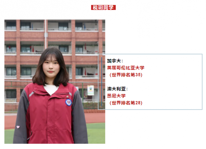 税玥同学雅思6.5分,在标化成绩不占优势的情况下,同样凭借丰富的申校背景从全球优秀学生中脱颖而出,获得加拿大英属哥伦比亚大学(世界排名第35)和澳大利亚悉尼大学(世界排名第28)的录取通知书。
