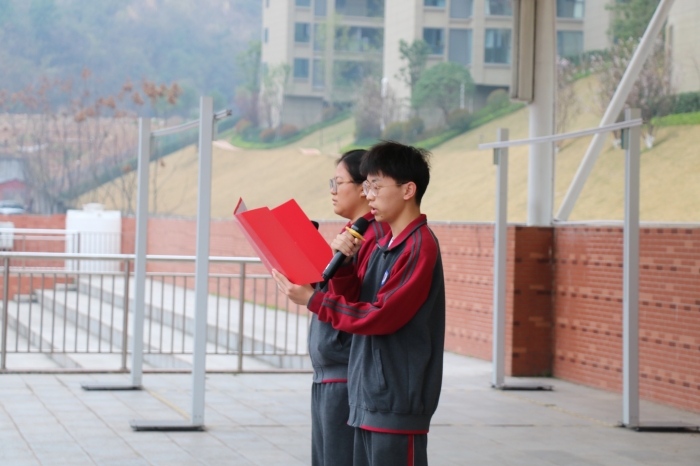 升旗仪式上,高三孙伟涛、郭恩盈同学发表《传承志愿精神 弘扬公益力量》国旗下讲话。