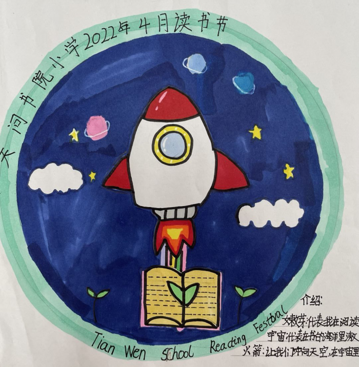 为了设计出符合读书节内涵的作品,小设计师们大显身手、精心设计,围绕着 “天问”“阅读”等元素,认真设计和不断修改自己的作品。构思、绘图、上色,流畅的线条,绚丽的色彩,寓意深刻的图案……都是对读书节的期待和对阅读的自我解读。
