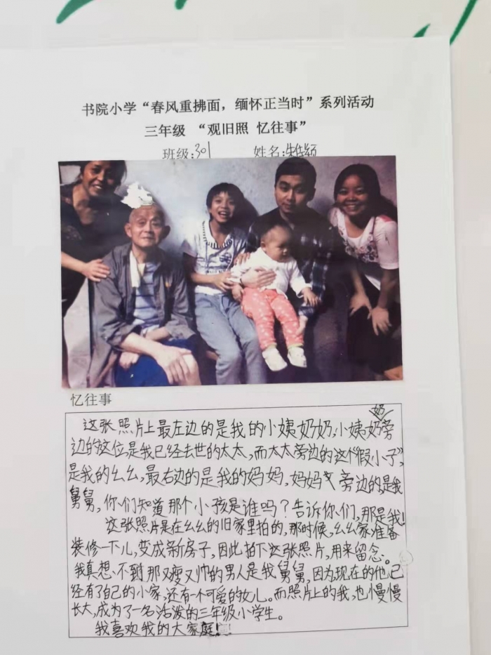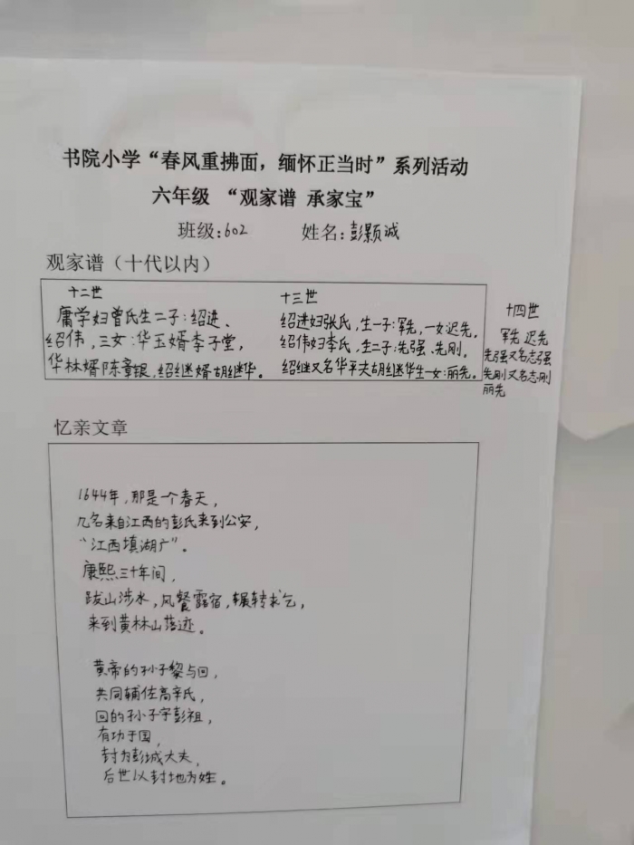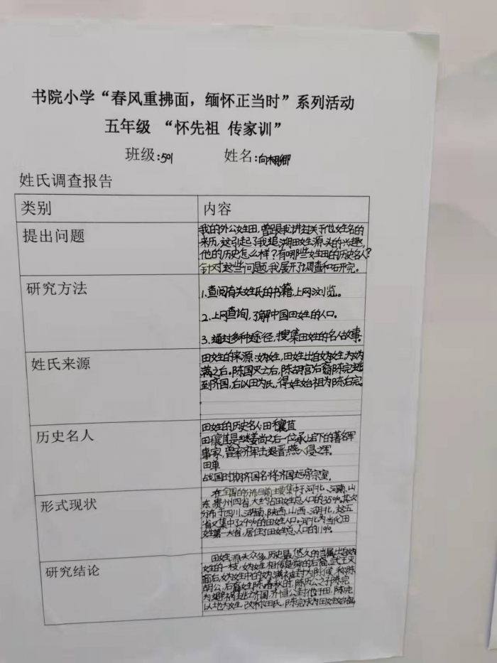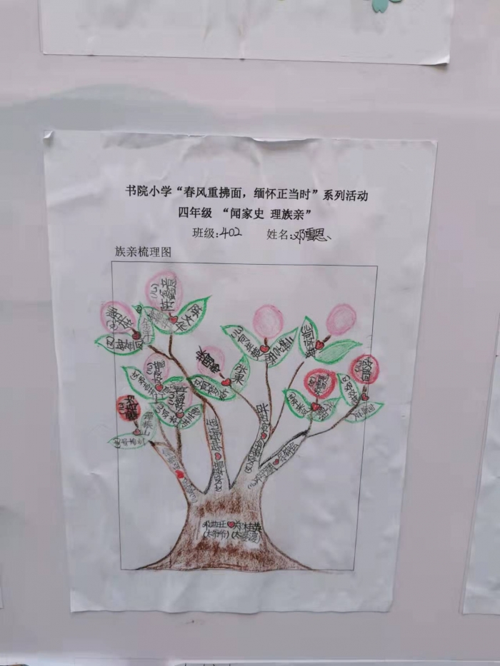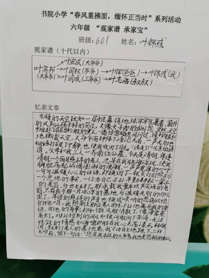 四月,天问书院小学开展了“清明寻根问祖”系列活动。学校为孩子们准备了特殊的清明节“作业”,孩子们在作业中崇德尚孝,感受中国传统文化的内涵,让优良传统美德扎根于书宝的心中。一年级:书姓名 绘家亲;二年级:知来历访族亲;三年级:观旧照忆往事;四年级:闻家史理族亲;五年级:怀先祖传家训;六年级:观家谱承家宝。