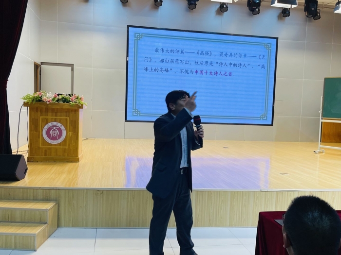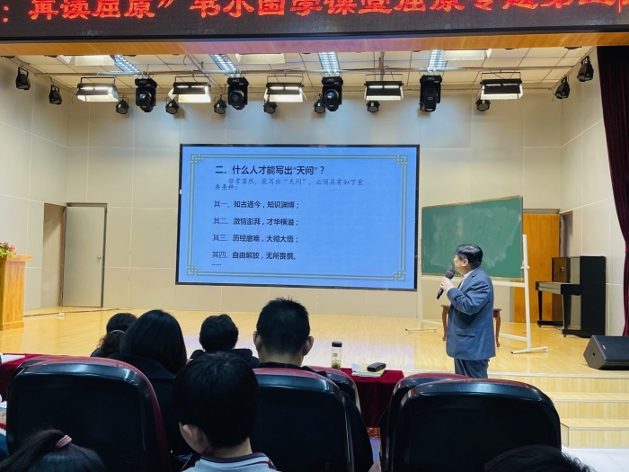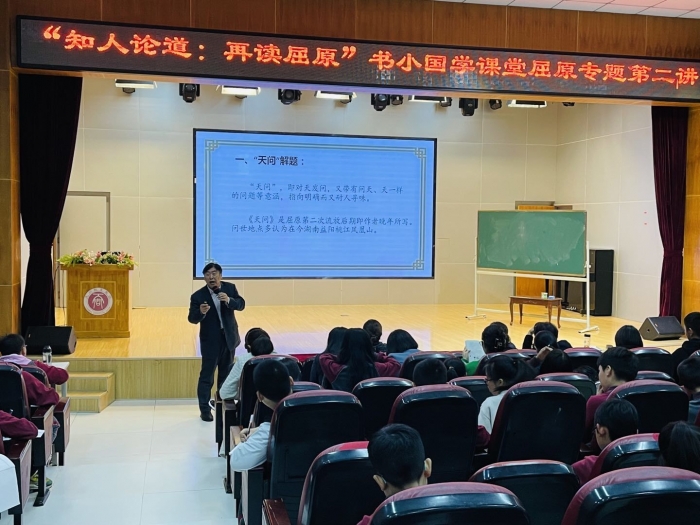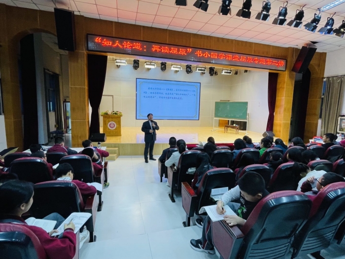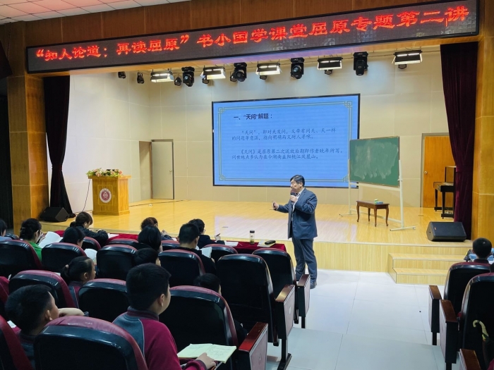 国学经典是我们中华民族5000年的文化和文明积淀,是先辈留给我们的最珍贵的瑰宝。天问书院小学自开办以来一直以坚持传承发展屈原文化为办学理念,将屈原文化与学校管理、课程建设、课堂教学、校园文化等紧密融合,讲屈原故事、诵屈原诗歌、研屈原故里,过屈原文化周。为学校发展输入强健诗魂,为师生人格注入爱国基因。4月14日晚上,天问书院小学4—6年级全体学生和所有老师齐聚大礼堂,聆听天问书院顾景荣院长带来的“知人论道,再读屈原”国学讲堂第二讲。