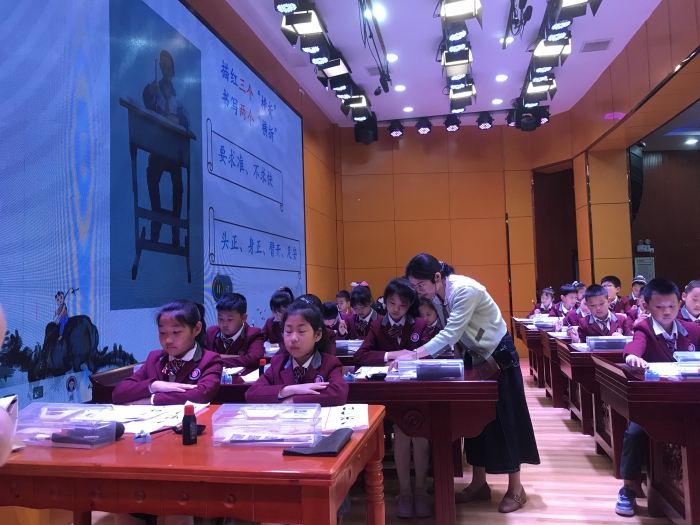紧张激烈的竞赛由来自邓村小学的熊祖悦老师执教的《月是故乡明》开启,一首首咏“月”的古诗把我们带入到了那个远古悠长的岁月,接下来的课程《横折》《捺》《短撇》《悬针竖》《长点》《长伸下横 降低重心》让在座的老师和同学在翰墨飘香中陶醉。7位参赛教师凭着对教学内容的理解感悟,别出心裁的教学设计、扎实的书法功底、适时到位的指导,引导学生认真临摹,掌握书写规律,静心书写,培养学生良好的写字习惯。