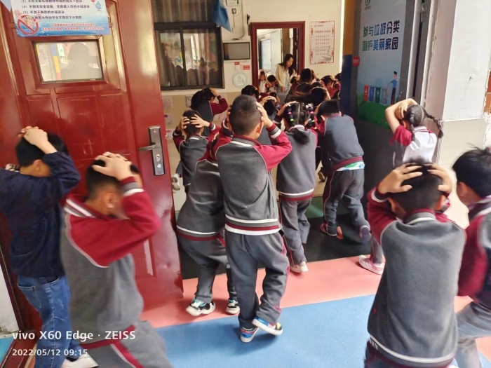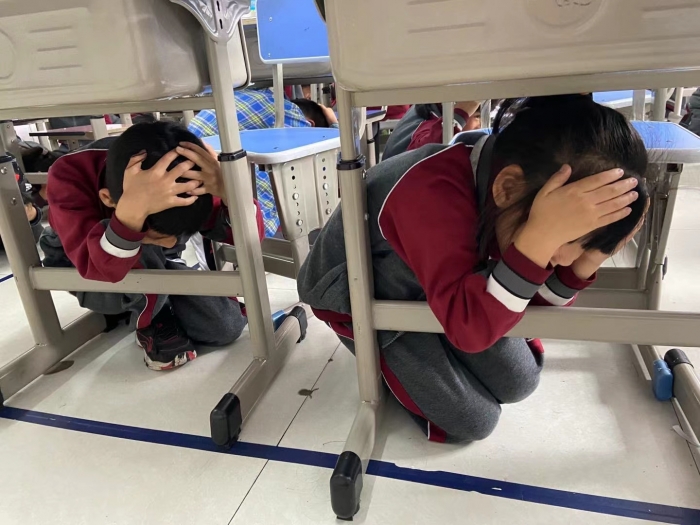 (通讯员:丁珊珊 照片:丁珊珊)早上8:59分,正沉醉于课堂中的学生和教师被一阵突如其来的警报声打断,所有师生迅速抱头躲到书桌下,10秒主震警报后,第二次逃生警报声响起,全体师生紧急疏散,迅速冲出教室跑到操场上的指定地点。各班迅速清点人数,并汇报德育处,全员集合完毕,共用时1分57秒。