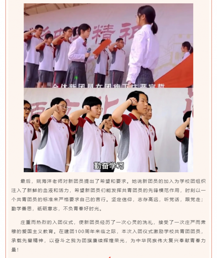 新时代的青年,青春正当时,奋斗正当时。希望高新天问初中广大团员青年一定不负韶华、踔厉奋发、笃行不怠,在新时代新征程中留下青春奋斗的鲜明印记,以优异的成绩喜迎建团百年和党的二十大!