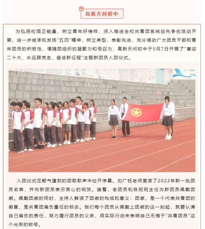 为喜迎党的二十大,庆祝中国共产主义青年团成立100周年,传承和发扬“五四”精神,不断提升共青团组织力、凝聚力、战斗力,充分展示师生蓬勃向上的精神风貌,高新天问初中团组织围绕“喜迎二十大 永远跟党走 奋进新征程”主题组织开展了入团表彰活动。
