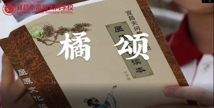 老师带领同学们一起诵读屈原诗歌《橘颂》,还为诵读配备音乐,语调铿锵有力,荡气回肠,诗境颇浓。