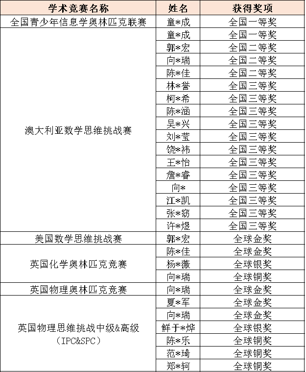 近年来,学校竞赛成绩百花齐放,捷报频传,仅2021-2022学年,就有28人次在全国青少年信息学奥林匹克竞赛、澳大利亚数学思维挑战赛、美国数学思维挑战赛、英国化学奥林匹克竞赛、英国物理奥林匹克竞赛等学术竞赛中获奖。