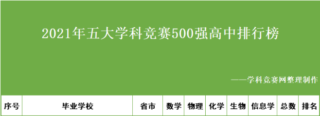 《2021全国500强中学之五大学科竞赛“省一”排行榜》是由学科竞赛网根据国家教育部、中国科协官方公示的名单制作发布,总结了各高中2021年获得数学、物理、化学、生物、信息学五大学科竞赛“省一等奖”情况,上榜学校代表了国内中学最强的学科竞赛实力。虽然“省一竞赛奖项的人数”并非评判中学实力的唯一指标,但从极重要的层面上反映了中学教学实力、师资力量和学校管理者意识。