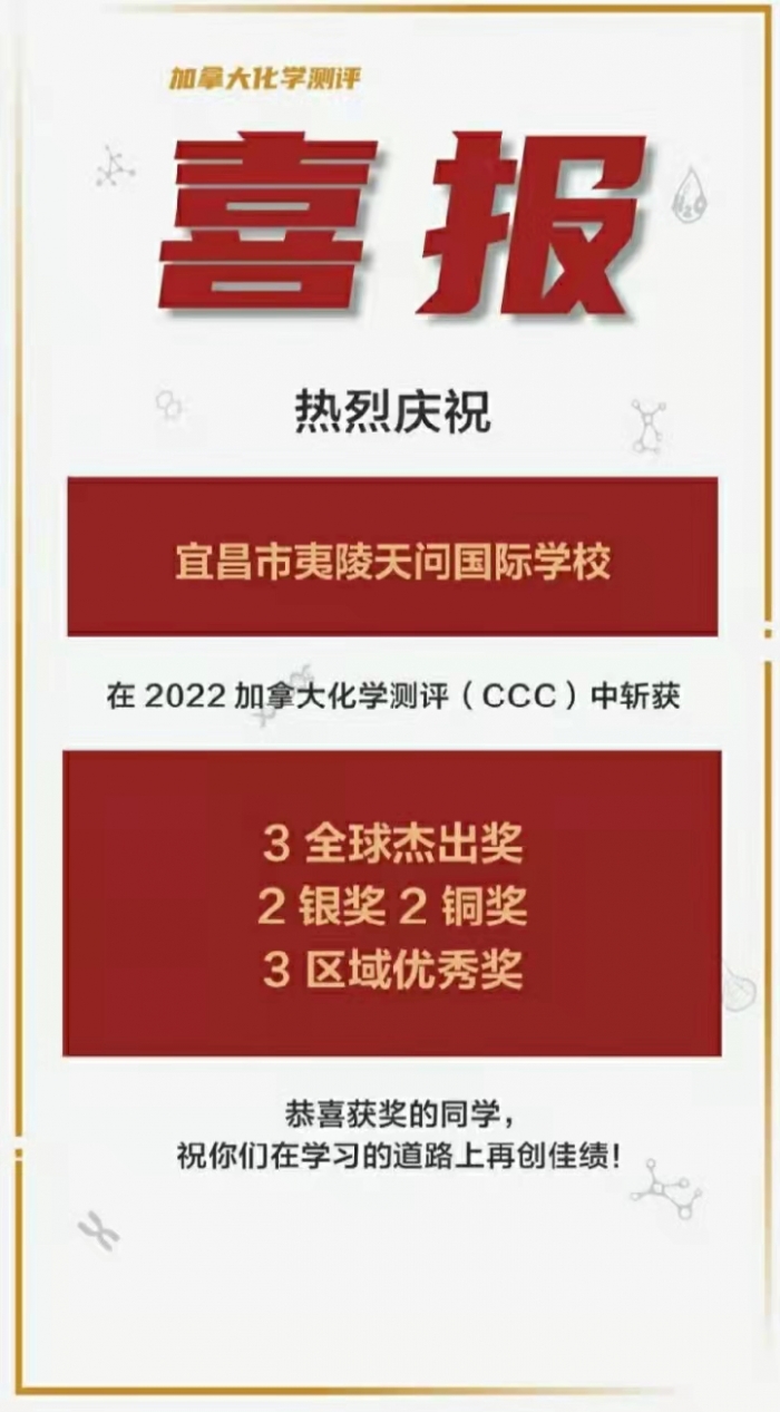 喜报!天问国高学子在2022年加拿大化学测评中再创佳绩,斩获3个全球杰出奖、2个全国银奖、2个全国铜奖和3个区域优秀奖。其中高二杨紫薇、向星瑞、陈思佳三名同学荣获全球杰出奖!