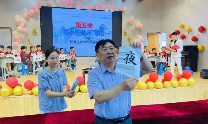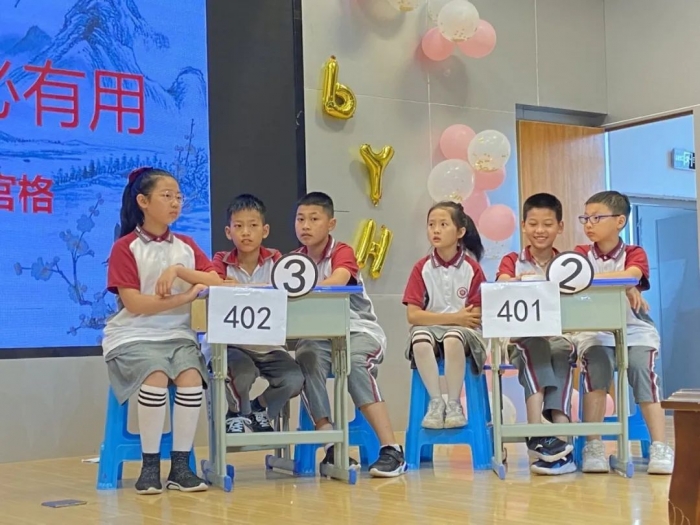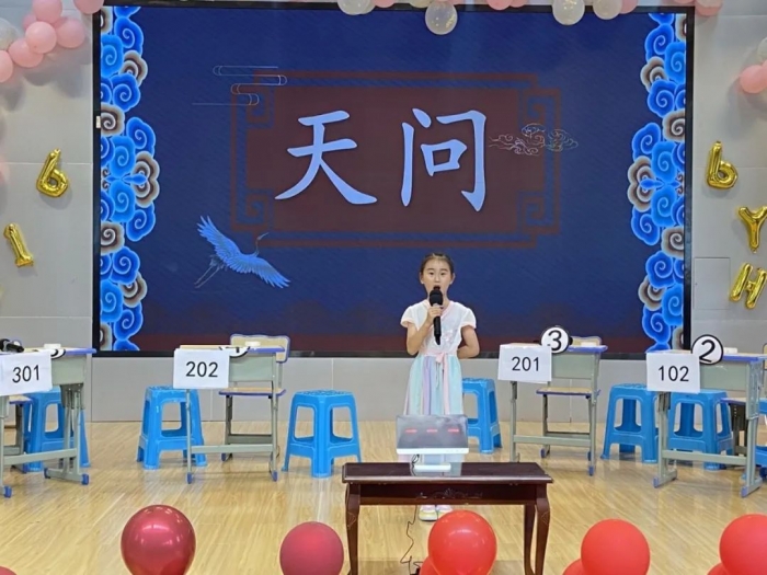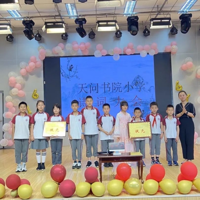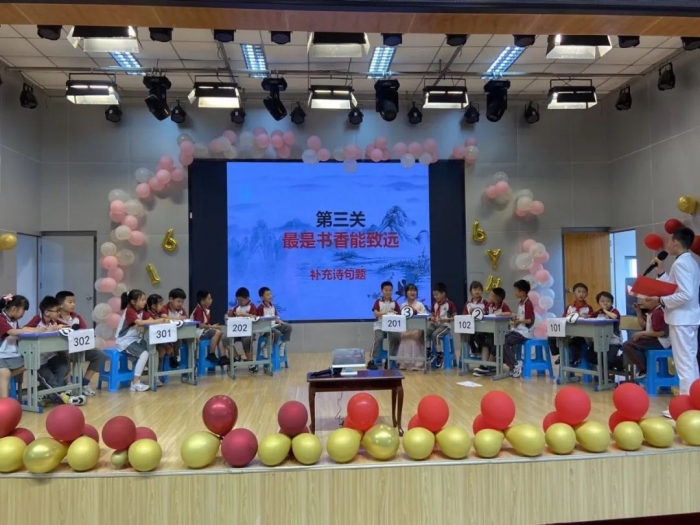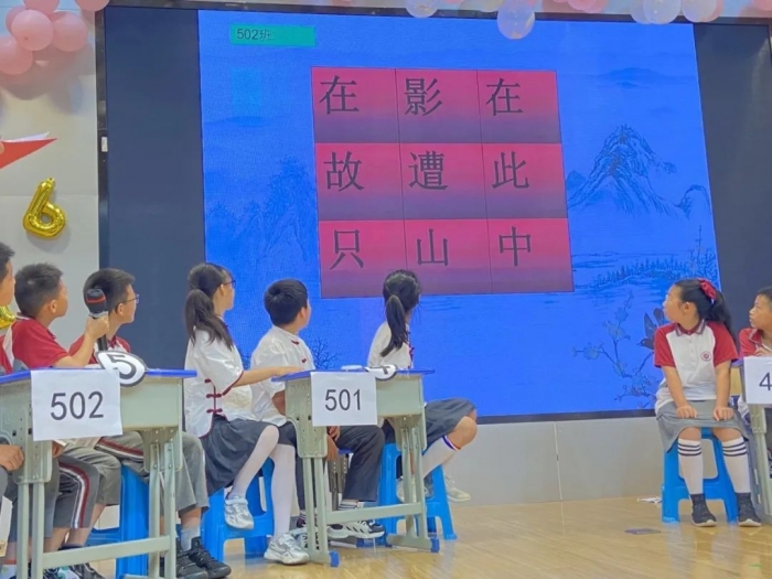 2022年6月2日,天问书院小学举行了第四届书院诗词大会,全仿真央视诗词大会:九宫格、十二宫格、上下对、诗配画、文化常识、飞花令........赛场上,选手个个摩拳擦掌,意气风发,没抢到答题权的同学不禁扼腕叹息,抢到答题权的同学饱含兴奋之情说出问题答案。台下的观众不禁被台上的紧张激烈的氛围感染,时而鼓掌喝彩,时而屏息凝神。