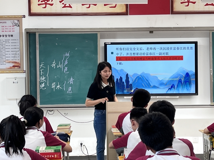 上午第一节课,805班姚海洋老师执教八年级课文《与朱元思书》。课堂教学中姚老师以“奇山异水,天下独绝”为切入口,从画面欣赏、字词品味、手法运用、景情关系四个角度,在一遍遍诵读中,带领学生一同品悟了山川之美。