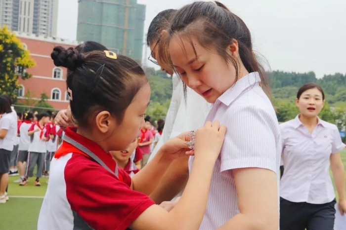 现场,学生还为老师们戴上了一枚枚精致的胸针。胸针由学校购买,让孩子们亲手为每一位老师佩戴。