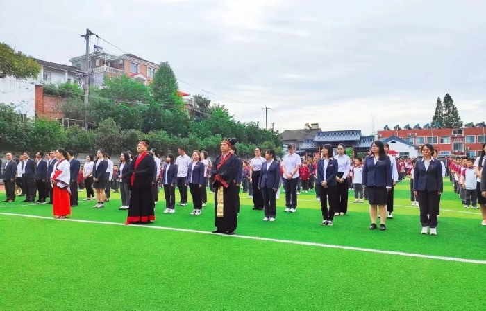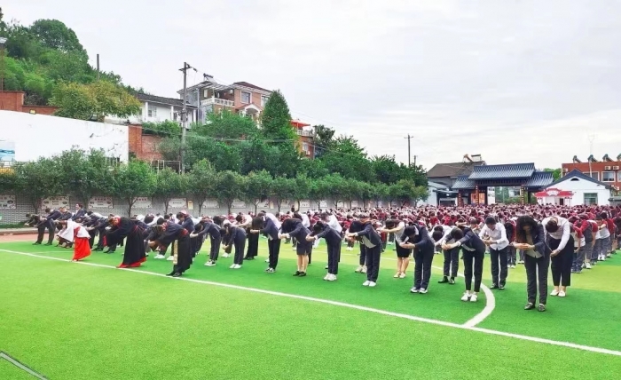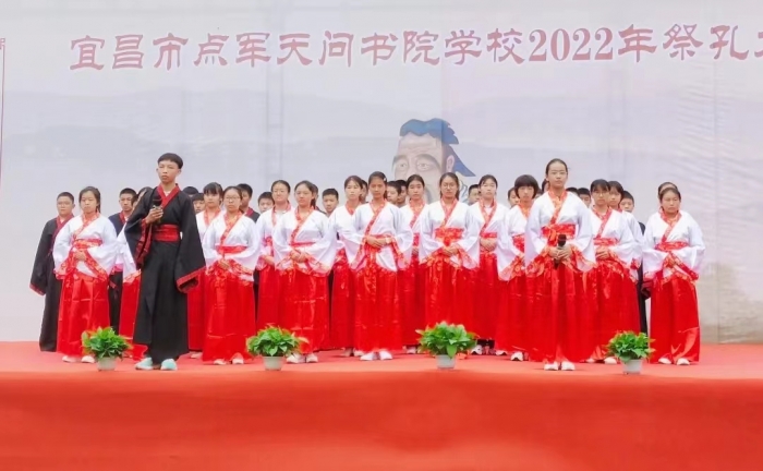 参天之木,必有其根;怀山之水,必有其源。 先圣孔子,将其深刻的思想精髓、高远的价值取向,贯注到中华民族的文化生命中;儒家思想也成为了中华民族文化宝库中,最为珍贵的财富。9月28日,天问书院全体师生齐正衣冠、庄严整肃,以虔诚之心、崇仰之情,举行第八届祭孔大典。 “其身正,不令而行;其身不正,虽令不从......”千余名学生的齐诵声洪亮而振奋人心。吟诵经典,让民族精神在血脉中流淌。 鼓乐雄浑,庄严肃穆。仪式主祭官顾景荣院长身着汉服,率领担任陪祭官的初中部彭灿校长和小学部袁霖淋校长缓缓走到孔子像前敬献花篮,随后顾院长上台致祭辞,他鼓励孩子们高举儒家修身为本的精神,养成“温良恭俭让”的气质,追求“仁义理智信”的境界,将中华传统文化继承和发扬下去。 魂销万古,合德民心千秋事;颂拜今晨,后事始记圣人恩。 全校师生怀虔诚之心,肃正伫立向先师孔子行三拜礼:一拜孔子孝亲尊师,二拜孔子传承经典,三拜孔子勤学笃志。 随后,天问书院全体学生满怀赤诚,向辛苦培育自己的老师深深鞠躬。 天地不仁,以万物为刍狗,幸而天生孔子,以成至圣先师,闻乐知德,观舞澄心,识礼明仁,礼正月垂,大赞孔子。 清幽古调,舞韵翩翩。初中部和小学部学子精心准备、倾情献上顾景荣院长所作的《孔子赞》朗诵以及歌伴舞《孔子说》,乐诵和鸣,响彻天际。 淮夏之衣,烈山有鼎。国学漫漫,长乐未央。我辈学子,应学先贤,潜心向学。 新学期,天问书院启动了“与诗同行,启美塑魂”诗教活动,本次“祭孔大典”也是同祭先师,传承中华传统文化。 弘扬传统文化,根植爱国情怀。天问书院还将通过寻诗、研诗、品诗等9大主题活动,弘扬中华传统文化,坚定文化自信,增强民族自豪感。