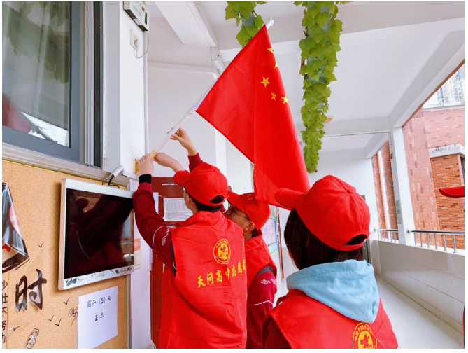 今年是党的二十大召开之年,也是中华人民共和国成立73周年,天问高中青年志愿者服务队在国庆节前夕,为全校各班教室门口挂上了鲜艳的五星红旗为祖国庆生。整座校园装点着幸福的“中国红”,一面面国旗,诠释着同学们的自豪感,也承载着对国家的归属感。随风飘扬的五星红旗,不仅让全体师生感受到了浓厚的节日氛围,更展现了天问高中学子昂扬向上、努力奋斗的精神风貌。
