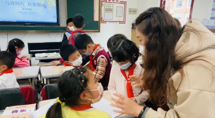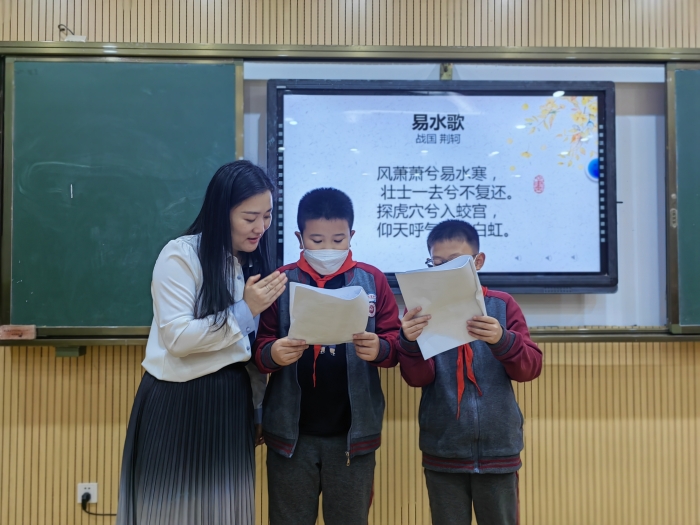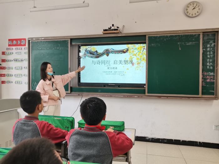 在诗词中感受音律之美,在音乐中体会诗词之意。高新天问小学音乐组老师积极响应集团号召,以配乐诗朗诵为载体,随堂指导学生跟着音乐吟诵诗词。