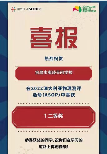近日,国际竞赛再传喜讯,天问国际高中高二年级郭峻宏同学在2022澳大利亚物理测评(ASOP)中荣获全国二等奖!