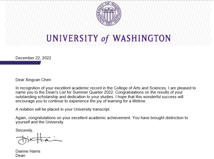 12月23日,天问国高2021届优秀毕业生陈星璨同学从美国华盛顿大学发来喜报,他因学术成绩优异,被评为2022年夏季学期成绩卓越奖。