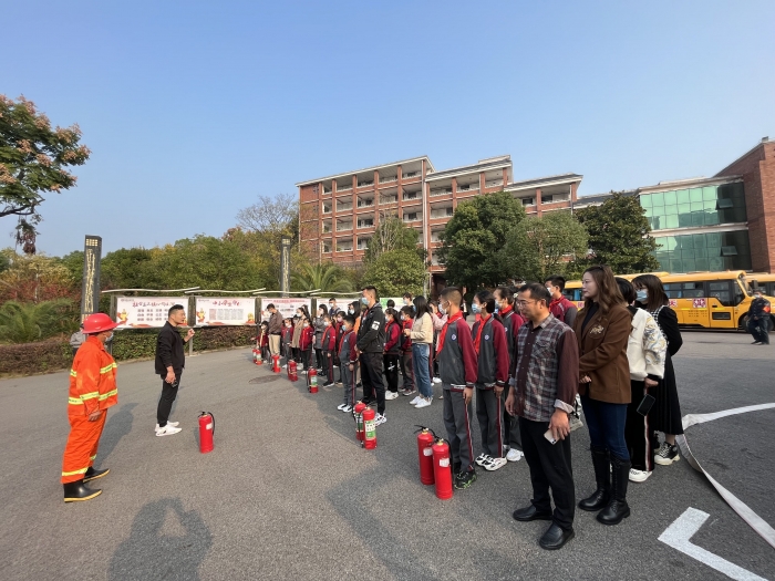 11月9日上午,1-6年级的学生来到校门口进行消防演练,学习灭火器的使用。