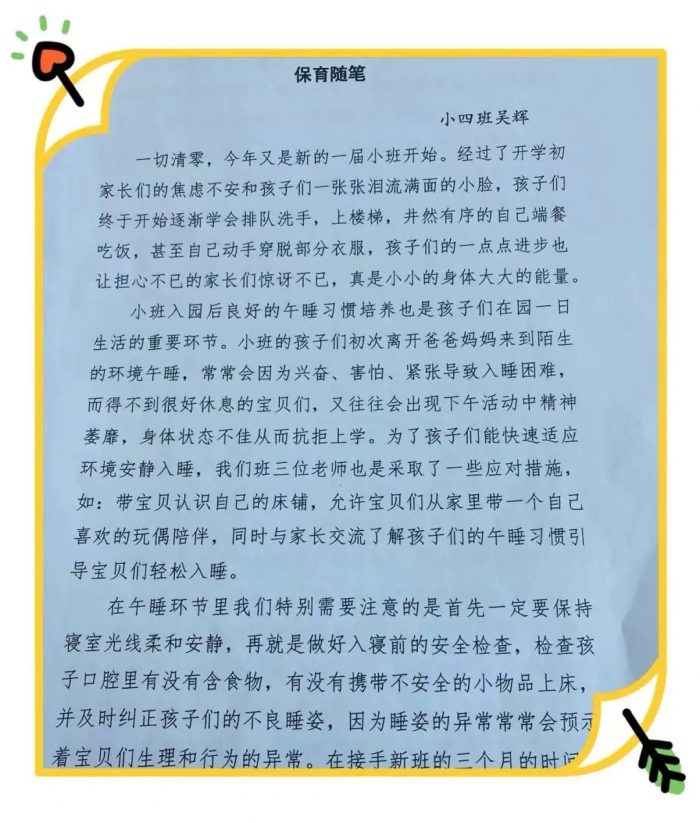 每个月,保育教师都会记录自己在保育工作中的感悟、反思或下一步工作计划,将与孩子们一日生活中的点点滴滴感动和成长都汇集在字里行间。