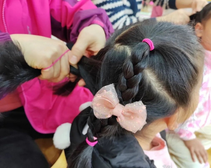 实操环节主要针对保育老师日常生活应知应会的内容,包括基础专业理论知识、物品消毒、消毒液的正确配比,以及呕吐物的处理方法进行实操培训,包括给小女孩梳头发等技能展示。