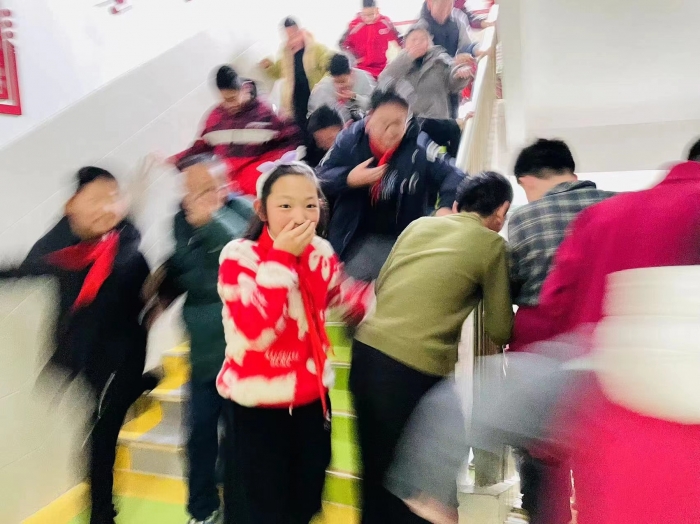 演练过程中,各班老师尽职尽责,立即告知学生“发生火灾,不要慌”,并带领学生迅速捂住口鼻,弯腰撤离教学楼。教学楼各层楼梯口安排了疏导员,协助老师处置疏散过程中的突发情况,防止学生相互推挤、窜序和掉队。