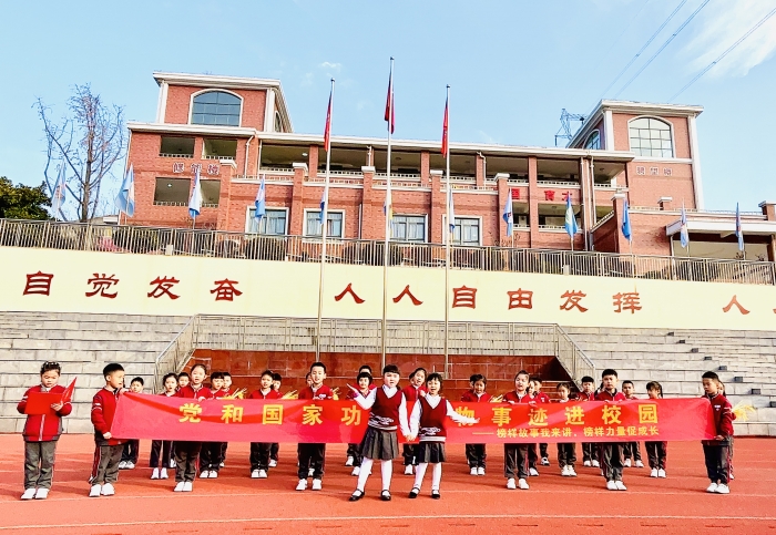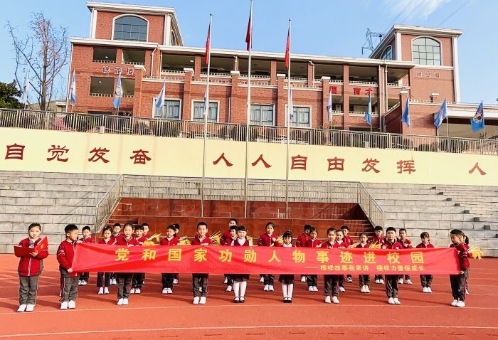 2023年3月6日,高新天问小学102纷缊班的学生们在国旗下展示,为全校师生介绍国家功勋人物袁隆平。