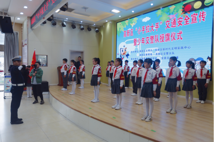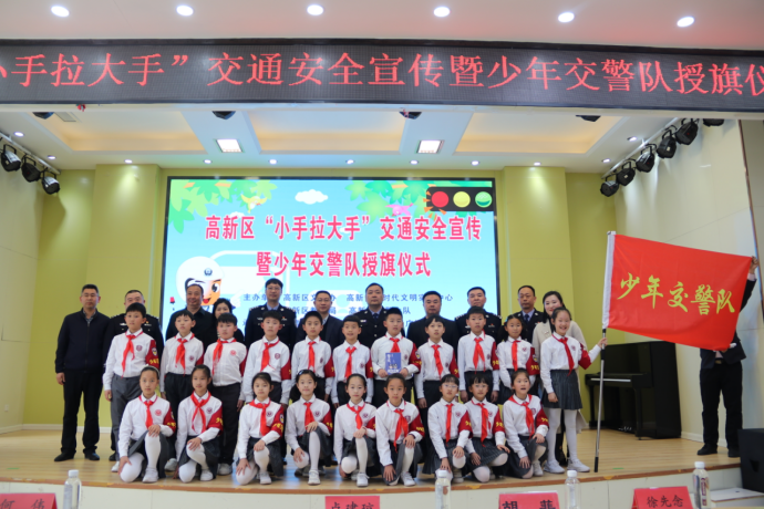 2023年3月17日上午,高新区“小手拉大手”交通安全宣传暨少年交警队授旗仪式在高新天问学校举行。