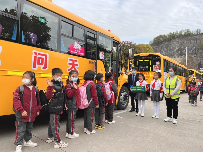 少年交警队队员们在交警叔叔的指导下,指引全校同学们有序排队,安全上校车,少年交警队员尽职尽责,在校车上认真检查同学们系安全带的情况。