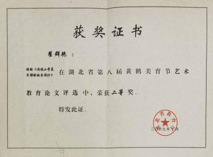 执教美术课,曾获宜昌市优质课竞赛一等奖。撰写教育论文,曾获得由省教育厅主办的黄鹤美育节论文二等奖、宜昌市一等奖。她所教授的高年级软笔书法,也成了学生们最喜欢的课程之一。在翟老师的课堂上,既能感受书法魅力,还能锻炼书写能力。