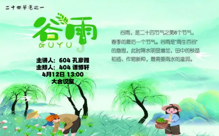 604班孔彦雅同学在讲台上落落大方的向同学们介绍着“谷雨”节气的历史渊源与民间习俗。