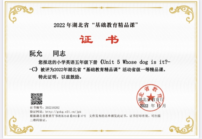 2022年12月,我校英语老师阮允执教的优质课五下《Unit5Whosedogisit?-C》,参加了教育部基础教育精品课遴选,该课例被评为湖北省精品课一等奖。
