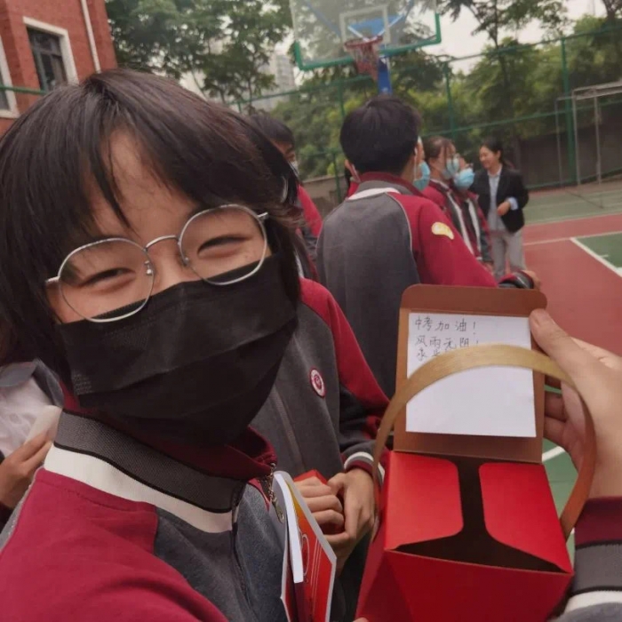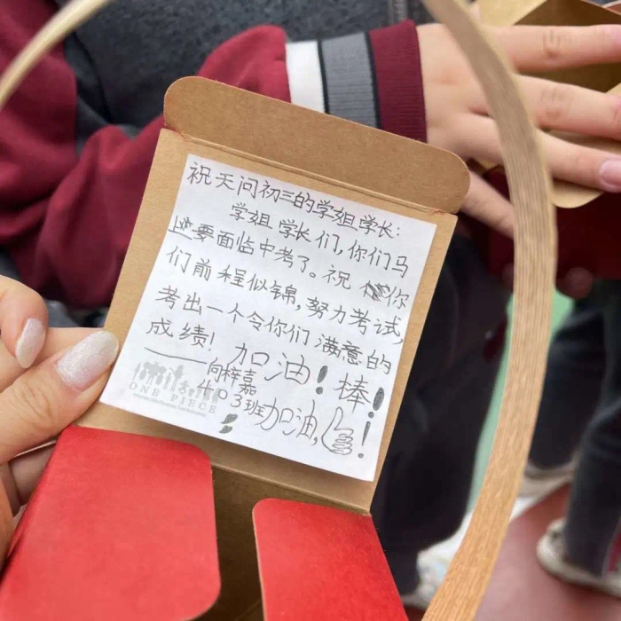 圆润饱满的桃子,经历小学部高年段同学的长期用心守护,集体采摘,中年段同学精美的包装,写下诚挚的祝福,再到低年段小朋友的双手献礼,温馨祝福,传到了初三同学们的手中,这不仅是真诚的祝福,也是一份来自高新天问大家庭的爱意,一种拼搏精神的传承,更是天问人上下求索精神的最好诠释。
