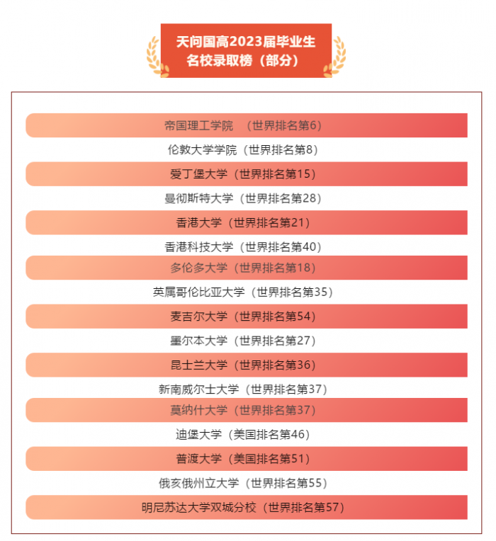 喜报!天问国际高中2023届毕业生留学申校再创新高,目前已收获来自英国、美国、澳大利亚、加拿大和中国香港等地的100多份世界名校录取通知书,其中98%进入世界前100大学,48%进入世界前30大学,33%进入世界前20大学,10%进入世界前10大学!包括英国帝国理工学院、伦敦大学学院;香港大学、香港科技大学;加拿大多伦多大学、麦吉尔大学;美国迪堡大学等世界顶级名校!