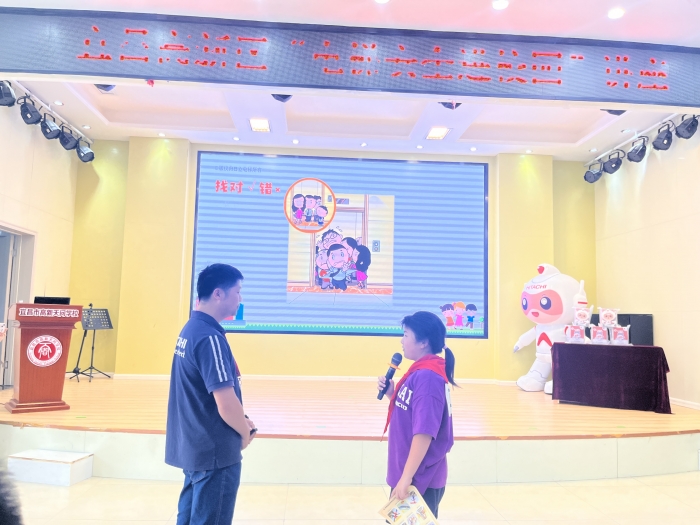 2023年6月8日,高新天问小学与宜昌高新区市场监管局、日立电梯(中国)有限公司宜昌分公司在报告厅联合开展了生动有趣的“电梯安全进校园”电梯安全主题活动。活动旨在提高小学生对电梯安全的认识和意识,促进学生自觉遵守电梯安全规定,增强学生的自我保护意识,减少电梯事故的发生。高新区市场监管局胡晨晨、高新天问小学校长胡菲、学校后勤主任胡俊峰及四年级全体学生参加了此次活动。