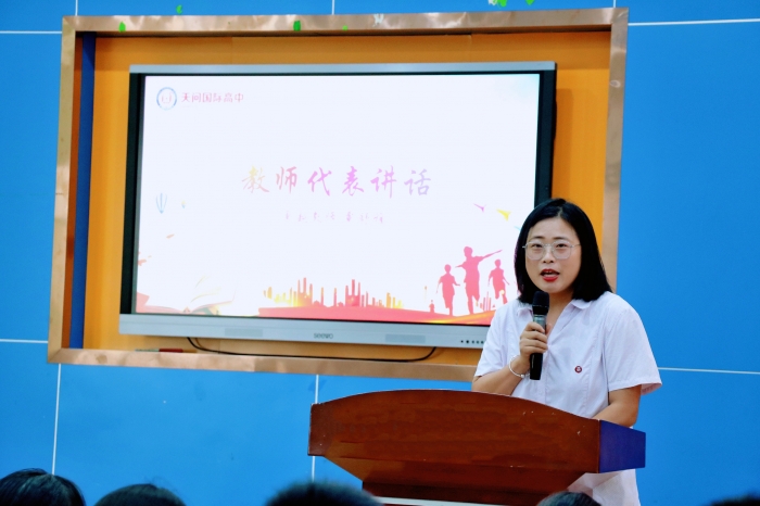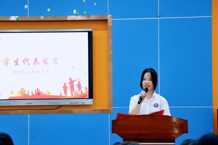 教师代表覃舒雅老师鼓励同学们在新学期勇敢挑战自我,拥有“成长心态”,每天都比昨天进步一点,向着自己的目标不断迈进。
