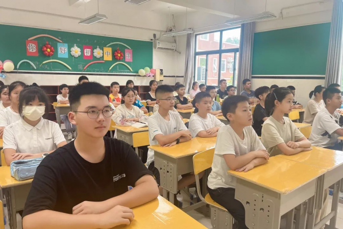 开学当日,七、八年级组教师团队身着统一的校服,整齐的列队在校门口,热情的迎接新生和家长。
