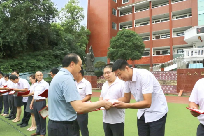活动中,天问教育集团党委副书记、点军天问书院学校党支部书记代德凯同志宣读2023届卓越贡献奖教师名单,天问教育集团工会主席姚太权、点军天问书院学校名誉院长顾景荣、点军天问书院学校校区兼天问书院-28中教联体执行校长彭灿为老师们颁奖。