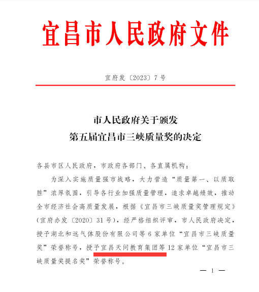 10月16日,《市人民政府关于颁发第五届宜昌市三峡质量奖的决定》公布,天问教育集团榜上有名。