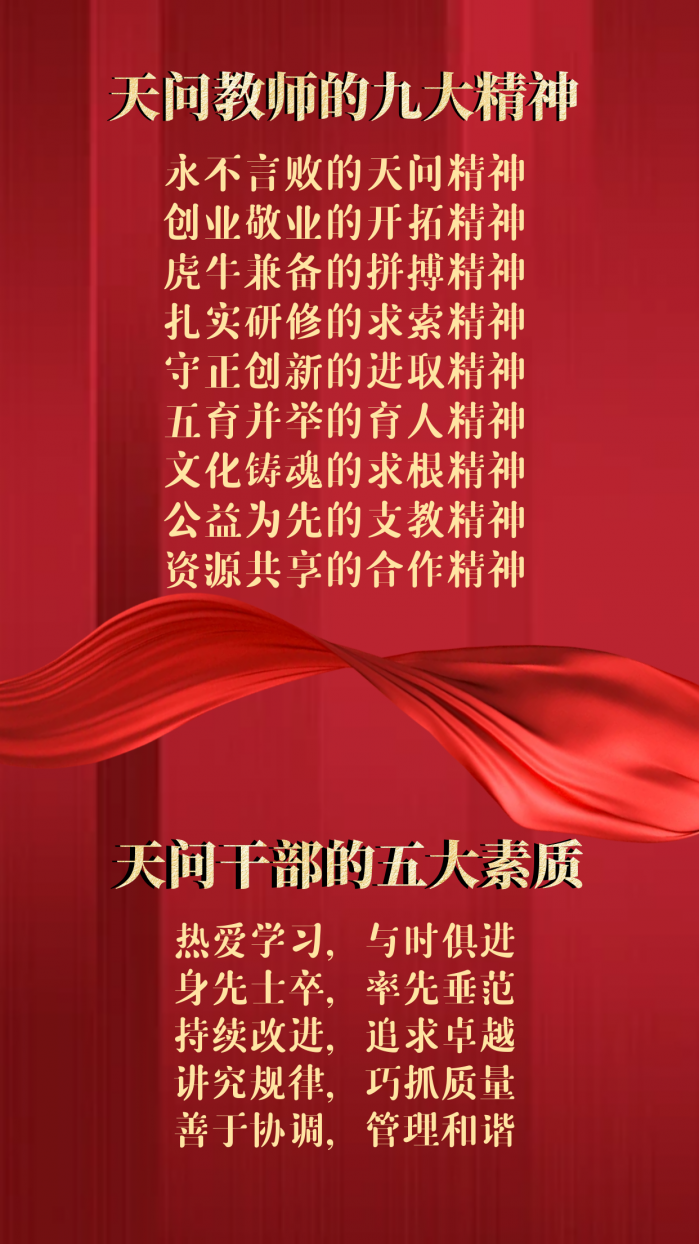 20年的时光很美好,20岁的天问正年轻。 自主课堂,四课研训,合作打拼,正向激励。 浩渺行无极,扬帆但信风。通过实施党组织领导的校长负责制,导入卓越绩效规范过程管理,运用PDCA管理工具……建立了良好的运行机制。 在20年发展中,形成了天问教师的九大精神和天问干部的五大素质,打造出了一支高素质高水平的教师队伍。