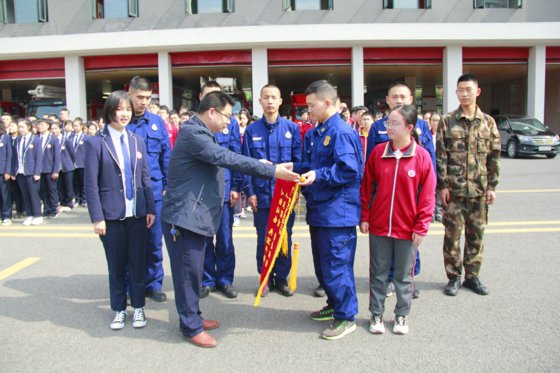 天问高中副校长杜可向夷陵区消防救援大队赠旗