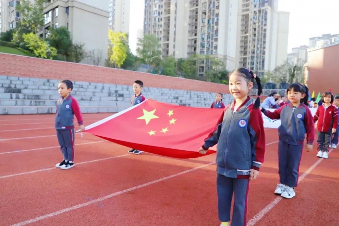 鲜艳的五星红旗在前面引路,欢快的入场曲在运动场回荡,小小护旗手们托举这鲜艳的五星红旗,昂首阔步走向主席台,从他们稚嫩的目光里,我们看到了未来看到了希望。